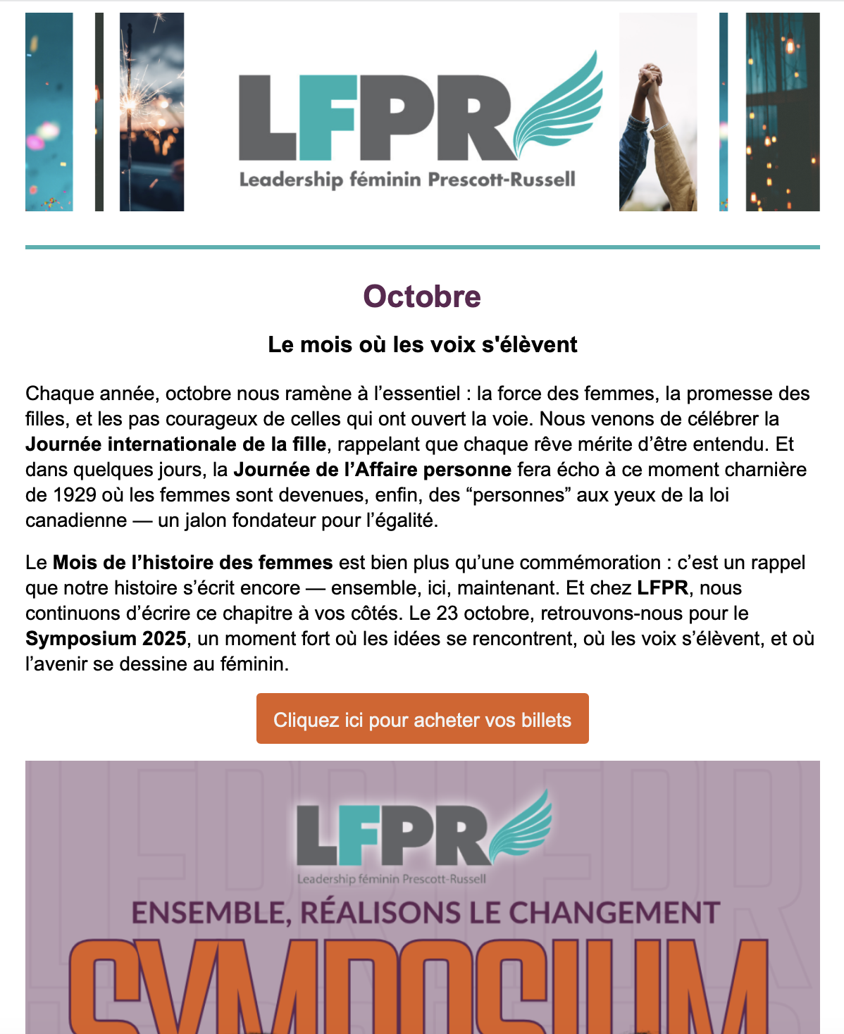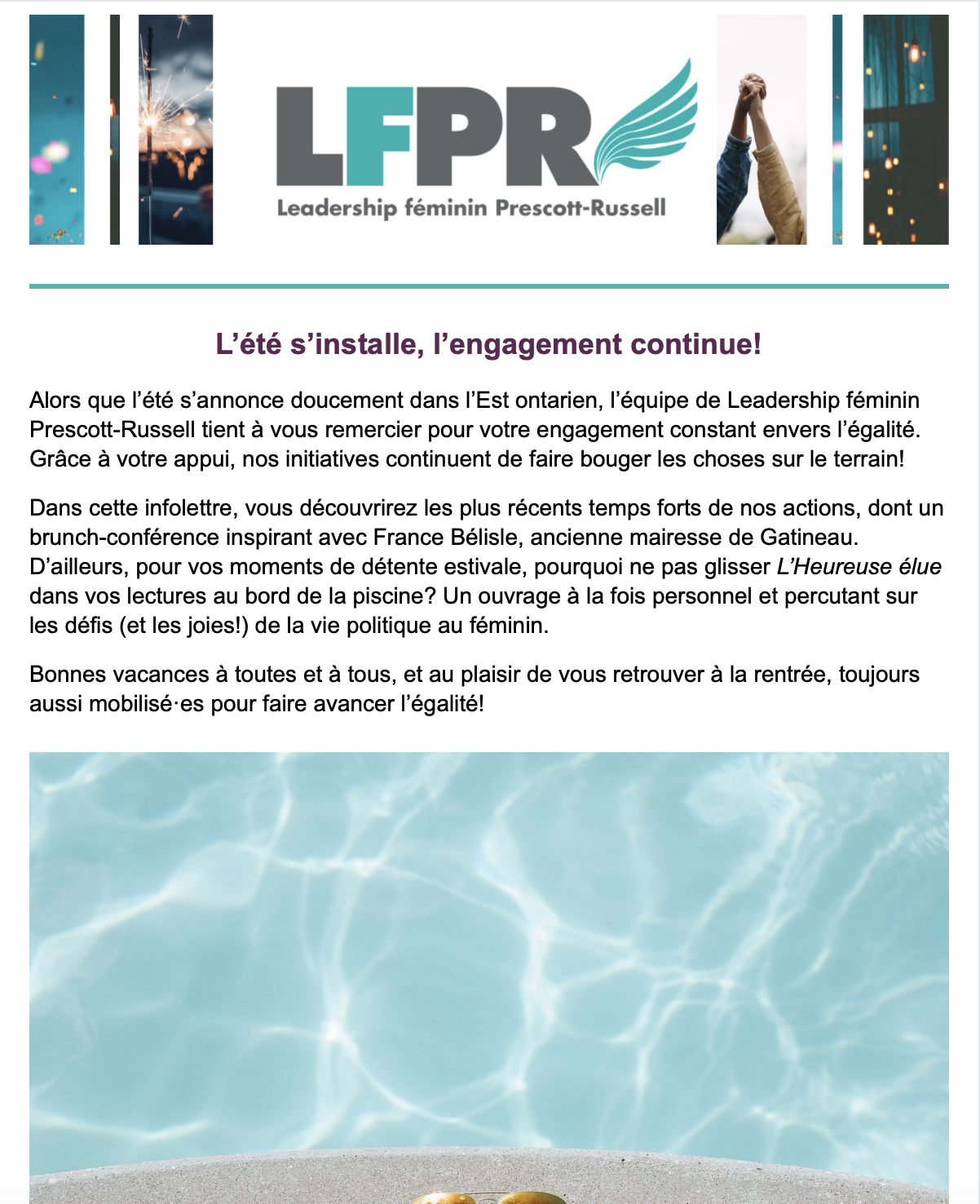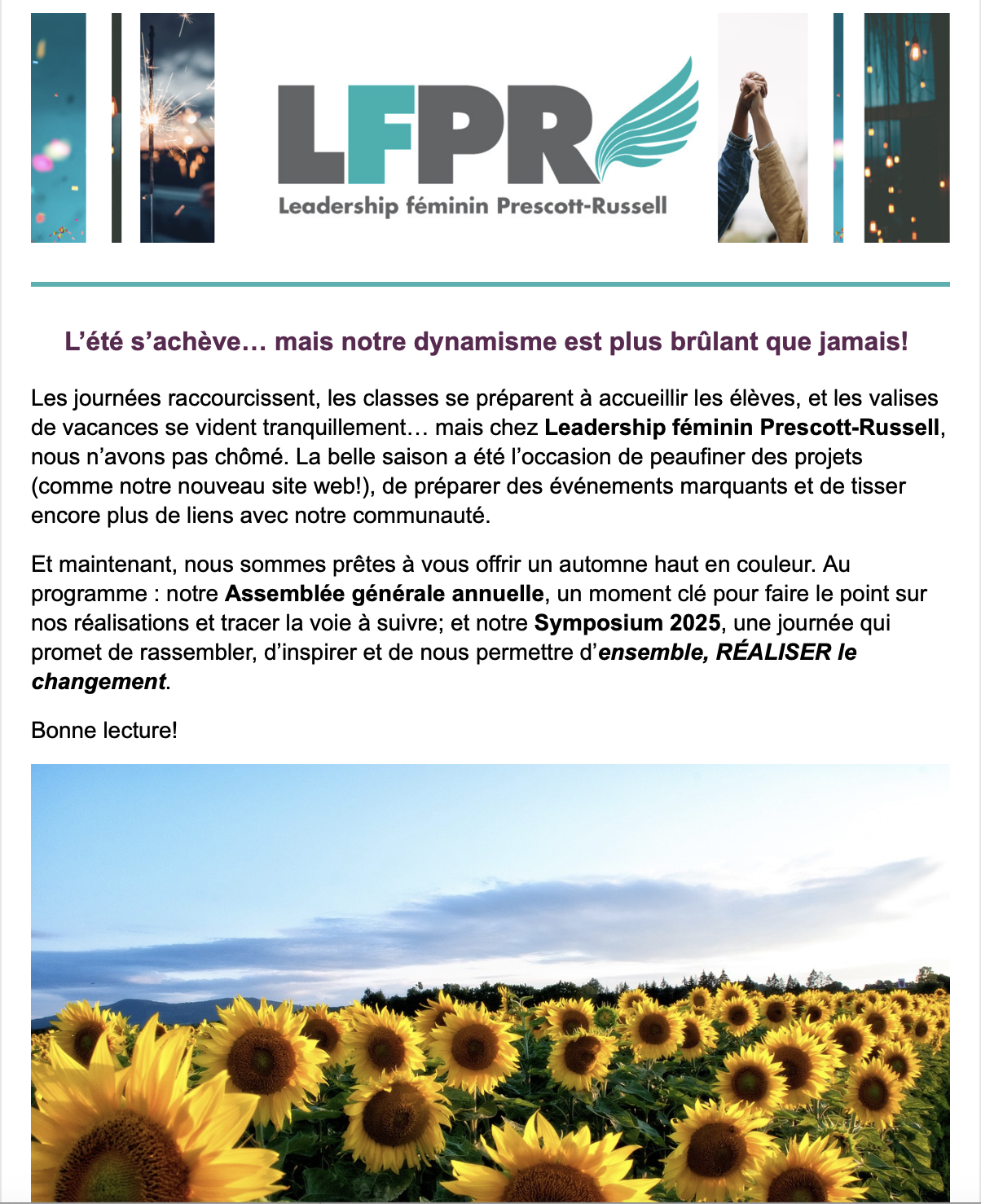 Restez connectés et informés! Abonnez-vous à notre infolettre pour recevoir directement les nouvelles, événements et initiatives de Leadership féminin Prescott-Russell.